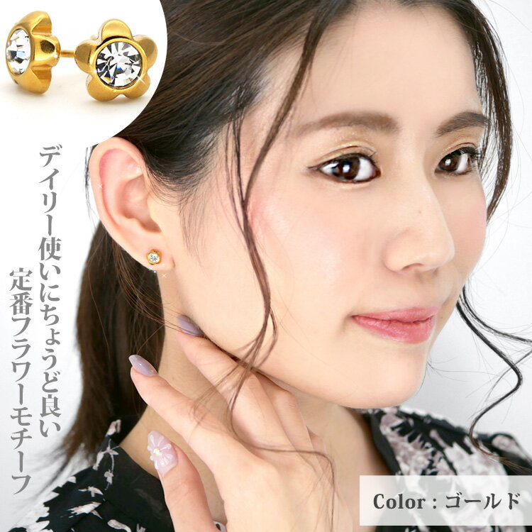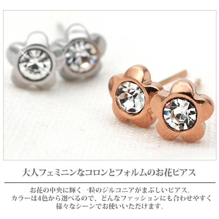 フラワー×ジュエルのキュートさいっぱいのピアス!肌に馴染みやすいピンクゴールドカラーは、ゴージャスな中にエレガントさも併せ持ち、大人なコーディネートにもオススメ! 素材には、金属アレルギーの方にも安心なサージカルステンレスを使用。