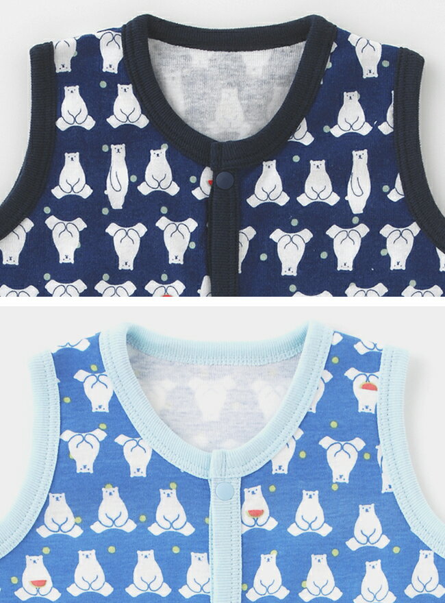 か わ い い 白 ク マ プ リ ン ト ころころ可愛い白クマさんをプリントした 爽やかなノースリーブの前開きロンパースです 夏のお部屋着やパジャマとしてはもちろん、 レッグウォーマーやボトムスを組み合わせれば ちょっとそこまでのお出かけもOK! 涼しげな水色と夏らしいネイビーの2色展開です 新 米 マ マ も 嬉 し い お 着 替 え 簡 単 前 開 き タ イ プ 新米ママも嬉しいお着替え簡単な前開きタイプです お出かけ先でのおむつ替えもラクラク 薄手で通気性の良い爽やかなフライスを使用しました 暑い夏にぴったりの素材です 禁無断複製、無断転載、 このホームページに掲載されている記事・情報・画像写真などの無断転載を禁じます。